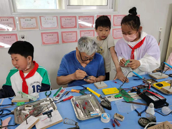 (图为高庄小学学生在蔡长生科技辅导员带领下,开展科技教育操作课程。)