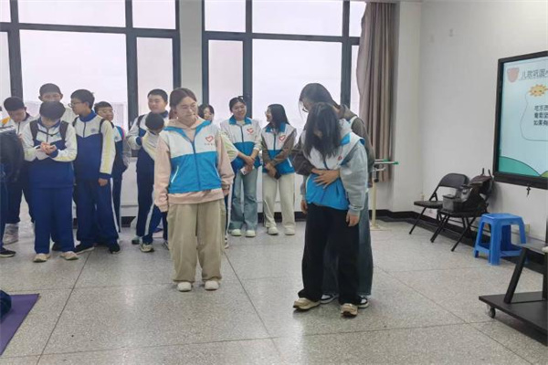 海姆立克急救法教学区同样热闹。志愿者结合小学生进食时易误吞糖果、坚果等异物的日常场景,用模型演示成人对儿童实施急救的标准动作:从背后环抱患儿,双手掌心向内交叠,置于肚脐与剑突之间,快速向上向内挤压,借助肺部残留气体形成的气流排出异物。现场,志愿者们亲身示范动作要领,同学们围站四周,仔细观察学习。为让同学们切实掌握技能,现场设置“实操体验区”,志愿者一对一指导同学们使用模拟道具练习,纠正手部位置、发力角度等细节。