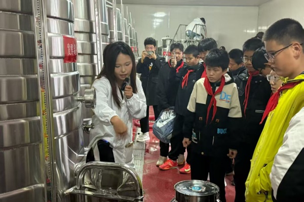 在葡萄酒实训中心,讲解员从葡萄原料的筛选、发酵过程的控制到酒窖陈酿的工艺细节,详细介绍了葡萄酒从“果实”到“佳酿”的蜕变历程,使同学们感受到了生物发酵的独特魅力。